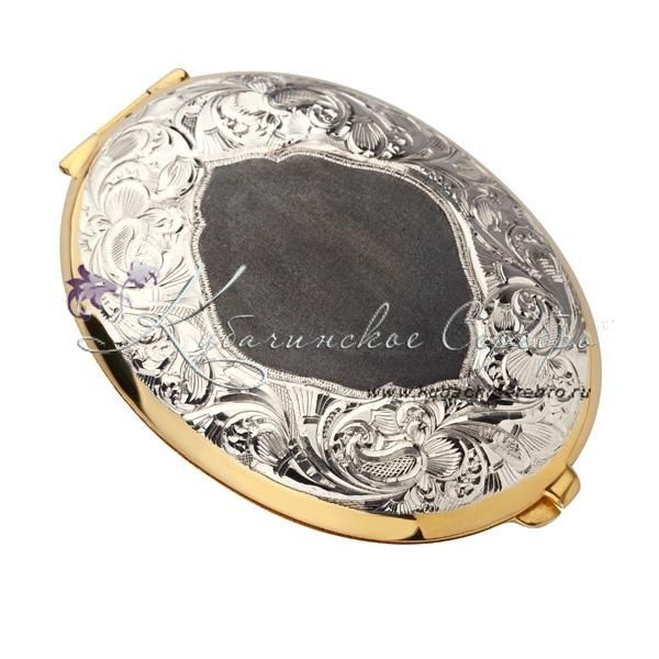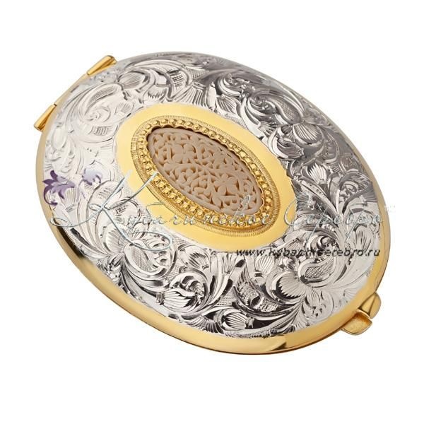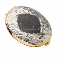 Корпус из серебра 875 пробы. С позолотой 999 пробы. Внутренняя часть покрыта материалом карпет. Вставка - восстановленная слоновая кость., сзади имеется оксидированная площадка под гравировку. Зеркальце увеличительное