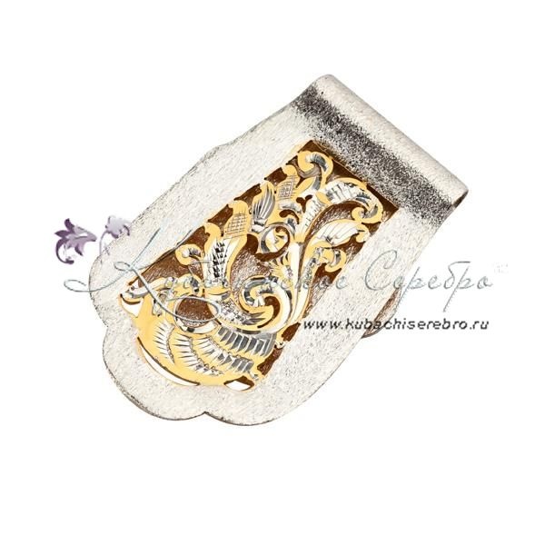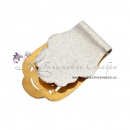 Серебро 875 пробы, с позолотой 999 пробы, поверхность матовая. Выпиленные узоры на лицевой стороне. Изделие в подарочном мешочке.