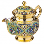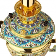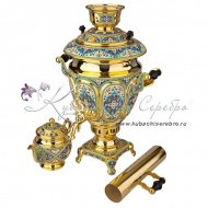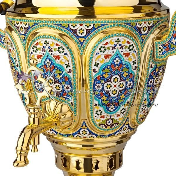Серебро 875 пробы, покрыт позолотой 999 пробы. Дровяной самовар с чайником, вставки - горячая эмаль. Гарантия высшего качества от фирменного магазина!