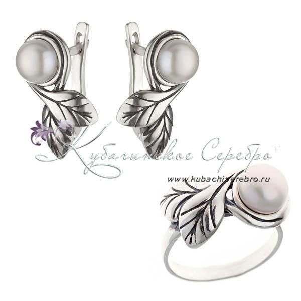 Серебряный комплект с жемчугом в листьях, арт №4489